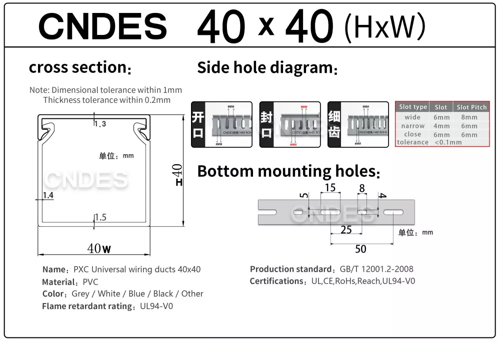 ທໍ່ສາຍໄຟ PVC ປະສິດທິພາບສູງ 40×40 ທີ່ມີການປົກຫຸ້ມຈາກ CNDES ເປັນການແກ້ໄຂການຄຸ້ມຄອງສາຍເຄເບີ້ນອະເນກປະສົງທີ່ອອກແບບມາສໍາລັບແຜງຄວບຄຸມຂະຫນາດນ້ອຍເຖິງຂະຫນາດກາງ, ຕູ້ອຸດສາຫະກໍາ, ແລະ enclosures ໄຟຟ້າ. ໂປຣໄຟລ໌ສີ່ຫຼ່ຽມມົນທົນ 40×40 ມມ ຊ່ວຍໃຫ້ມີການຈັດວາງພະລັງງານ, ສັນຍານ, ແລະສາຍຂໍ້ມູນຢ່າງເປັນລະບຽບ ໃນຂະນະທີ່ຂະຫຍາຍພື້ນທີ່ແຜງທີ່ມີໃຫ້ສູງສຸດ. ທໍ່ສາຍ PVC ແບບສະລັອດຕິງທີ່ມີຝາປິດມີການອອກແບບແບບ snap-on ຫຼືເລື່ອນເພື່ອເປີດ-ປິດໄດ້ໄວ ແລະບໍ່ມີເຄື່ອງມື. ບາງແບບມີເສັ້ນຕັດທາງສ່ວນຫນ້າຂອງ sidewalls ລຸ່ມສໍາລັບການຕັດງ່າຍຫຼືການໂຍກຍ້າຍເພື່ອຕອບສະຫນອງຄວາມຕ້ອງການການຕິດຕັ້ງສະເພາະ. ຮູ Screw ໄດ້ຖືກແຈກຢາຍຢ່າງເທົ່າທຽມກັນຢູ່ດ້ານລຸ່ມຫຼືດ້ານຂ້າງສໍາລັບການ fastening ໄວແລະງ່າຍດາຍ.