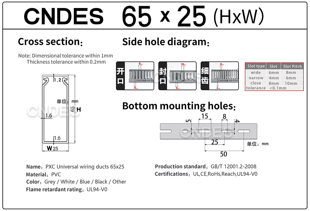 CNDES 'Customized 65×25 Cable Tray Ducts ເປັນຊ່ອງທາງການຈັດການສາຍບາງໆທີ່ຜະລິດຈາກ PVC ແຂງ. ມັນຖືກນໍາໃຊ້ຕົ້ນຕໍເພື່ອນໍາພາແລະປົກປ້ອງສາຍໄຟໃນພື້ນທີ່ບ່ອນທີ່: