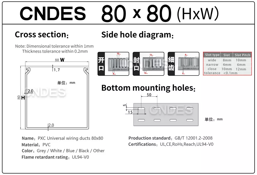ເມື່ອຖາດສາຍໄຟມາດຕະຖານບໍ່ສາມາດຮອງຮັບສາຍສາຍໄຟທີ່ຊັບຊ້ອນໄດ້, CNDES Customized 80×80 Slotted PVC Switchboard Wiring Duct ແມ່ນທາງເລືອກທີ່ດີຂອງເຈົ້າ. ດ້ວຍພື້ນທີ່ພາຍໃນຂະຫນາດໃຫຍ່ຂອງ 80mm * 80mm, ມັນໄດ້ຖືກອອກແບບໂດຍສະເພາະສໍາລັບສະຖານະການທີ່ມີຄວາມຕ້ອງການສູງເຊັ່ນ: ສາຍສາຍ backbone ຂອງສູນຂໍ້ມູນ, ກຸ່ມພະລັງງານອຸປະກອນອຸດສາຫະກໍາ, ແລະສາຍໄຟສູນກາງໃນຕູ້ຄວບຄຸມຂະຫນາດໃຫຍ່. ມັນໄດ້ຢ່າງງ່າຍດາຍຮອງຮັບແລະການຈັດຕັ້ງຈໍານວນຂະຫນາດໃຫຍ່ຂອງສາຍໄຟ, ອໍາລາກັບ clutter ແລະ congestion ຄັ້ງແລະສໍາລັບທັງຫມົດ.