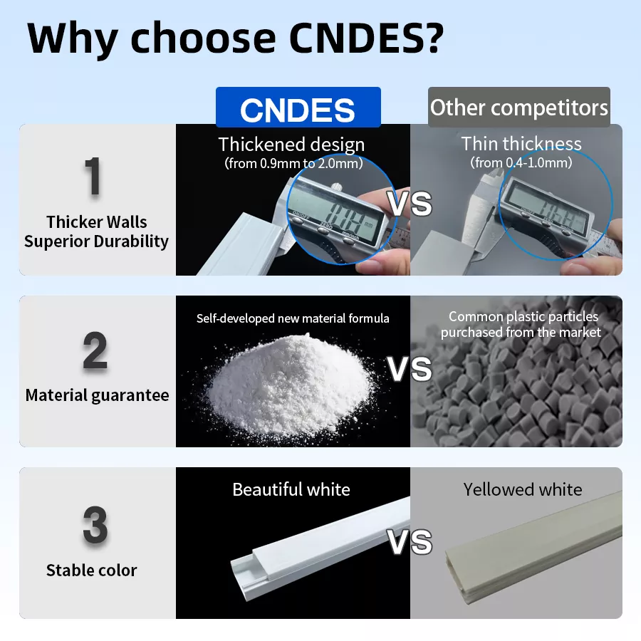 ປະສິດທິພາບສູງ PVC Surface-Mount Raceways ເປັນການແກ້ໄຂການຄຸ້ມຄອງສາຍເຄເບີ້ນທີ່ປະຫຍັດແລະປະສິດທິພາບທີ່ມີຂໍ້ດີເຊັ່ນຄ່າໃຊ້ຈ່າຍໃນການບໍາລຸງຮັກສາຕ່ໍາແລະການຕິດຕັ້ງງ່າຍ. ການອອກແບບທີ່ງ່າຍດາຍຂອງພວກເຂົາຊ່ວຍໃຫ້ທ່ານສາມາດຈັດລະບຽບແລະປົກປ້ອງສາຍໄຟໄດ້ໄວ, ເຫມາະສົມກັບການນໍາໃຊ້ທີ່ຢູ່ອາໄສ, ການຄ້າ, ຫຼືອຸດສາຫະກໍາ, ບໍ່ຈໍາເປັນຕ້ອງມີເຄື່ອງມືພິເສດຫຼືການຊ່ວຍເຫຼືອດ້ານວິຊາຊີບ. CNDES ໄດ້ລວບລວມຄໍາແນະນໍາການຕິດຕັ້ງຕໍ່ໄປນີ້ສໍາລັບທ່ານ.